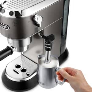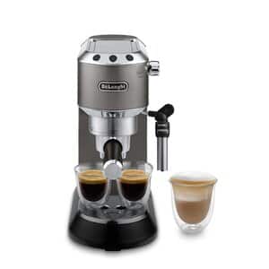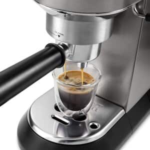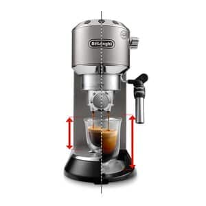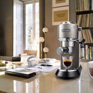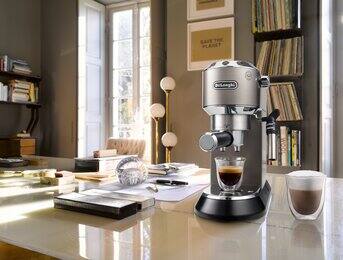 Stilvolle und kompakte Kaffeemaschine, die Ihre Küchenarbeitsplatte verschönert. Mit ihrem Gehäuse aus rostfreiem Edelstahl und dem matten Titan-Finish verleiht die Dedica-Espressomaschine jeder Küche einen Hauch von authentischem italienischem Design. Genießen Sie einen ergiebigen, milden Espresso oder runden Sie Ihren Kaffee mit einem samtigen Milchschaum mit dem verstellbaren Cappuccino-System ab.