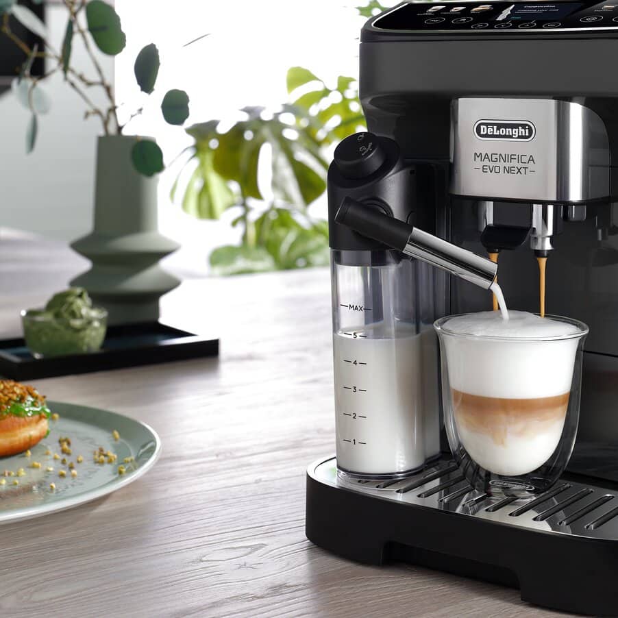 Mit der Magnifica Evo Next erleben Sie die perfekte Kombination aus langjähriger De'Longhi-Expertise, Innovation und modernster Technik für herausragenden Kaffeegenuss. Mit einer Auswahl von 10 Rezepten erfüllt sie jeden Kaffee-Wunsch und ermöglicht eine einfache Bedienung durch die benutzerfreundliche Oberfläche mit farbigen Icons und einem TFT-Display. Personalisieren Sie Ihre Getränke mit 5 Größen, 4 Intensitätsstufen und 3 Temperaturoptionen und genießen Sie den feinen, reichhaltigen Milchschaum dank der LatteCrema Hot Technologie für all Ihre Milchgetränke.