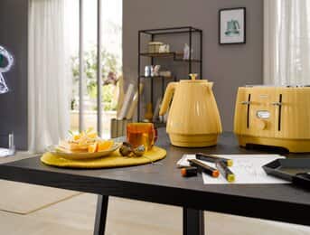 Wake up to creativity each morning with a kettle that embodies Italian craftsmanship, the De'Longhi Ballerina. Enrich your living space with its shiny Gold Yellow shade inspired by Venetian glasswork, the perfect reflection of your personality. With 1.7l capacity, a detachable base for cordless use and a washable removable filter, this stylish kettle is a joy to use and a pleasure to admire.