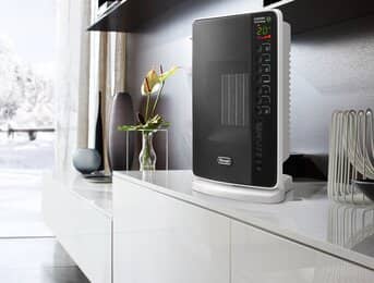 The DCH7093ER is an efficient ceramic heating element that provides fast and powerful spot heat with a maximum power of 1500 W. It features quiet operation, easy to use digital controls with 3 power settings to optimize the energy consumption, adjustable thermostat, timer and advanced Eco-Plus function.
