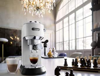 Small and compact. Thanks to its 15 cm width,Dedica is the slimmest pump coffee maker around.