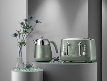 Enjoy the convenience and intuitive controls of the De’Longhi Luminosa electric toaster, evoking harmony in Twill Green. Bring glimmering light reflections to your kitchen with the rich matelassé finish, adding a precious touch to minimalist kitchens or reinforcing the glamour of more classic ones.
