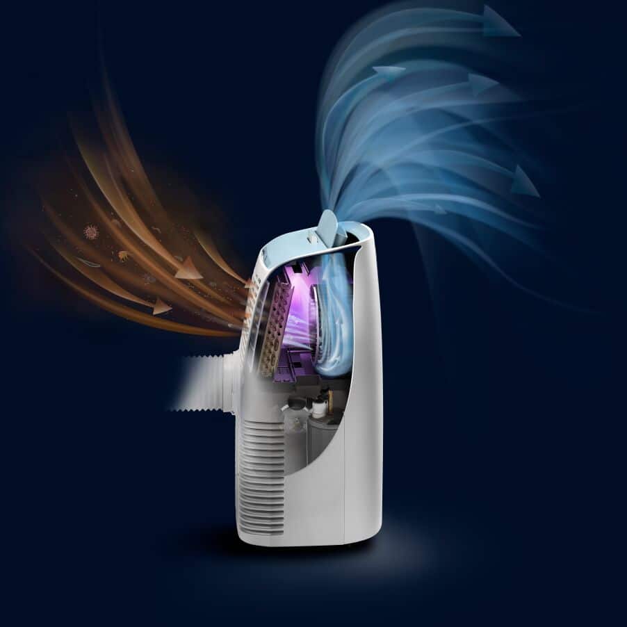 Refroidissement puissant des pièces avec un dispositif UV qui aide à réduire la propagation des virus et des bactéries dans l’air.