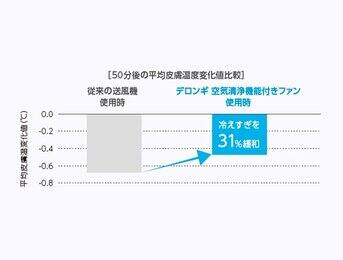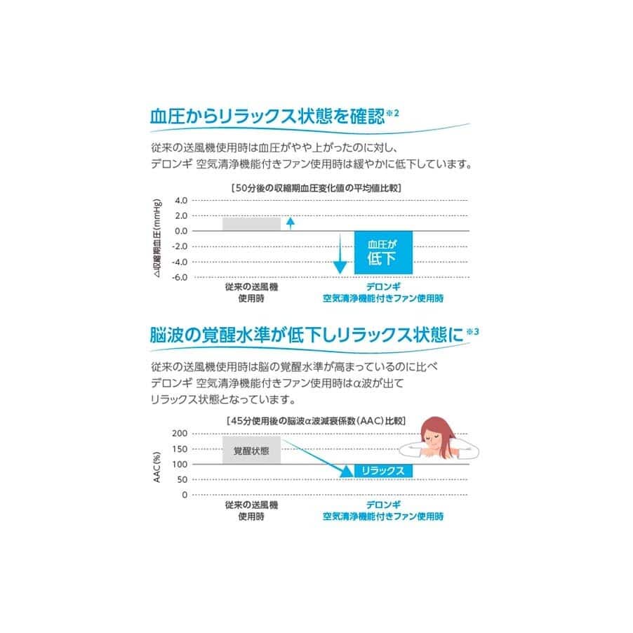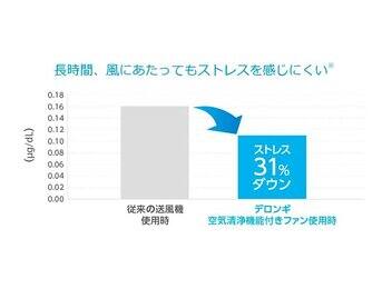 デロンギ 空気清浄機能付きファン使用時はストレスが少なく、 従来の送風機使用時と比べ31%リラックスしています。