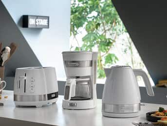 日本のどんなキッチンスペースにもぴったりとフィットするアクティブシリーズ。同じコンセプトでデザインされた5杯取りのコーヒーメーカーとポップアップトースターとセットで揃えられます。
