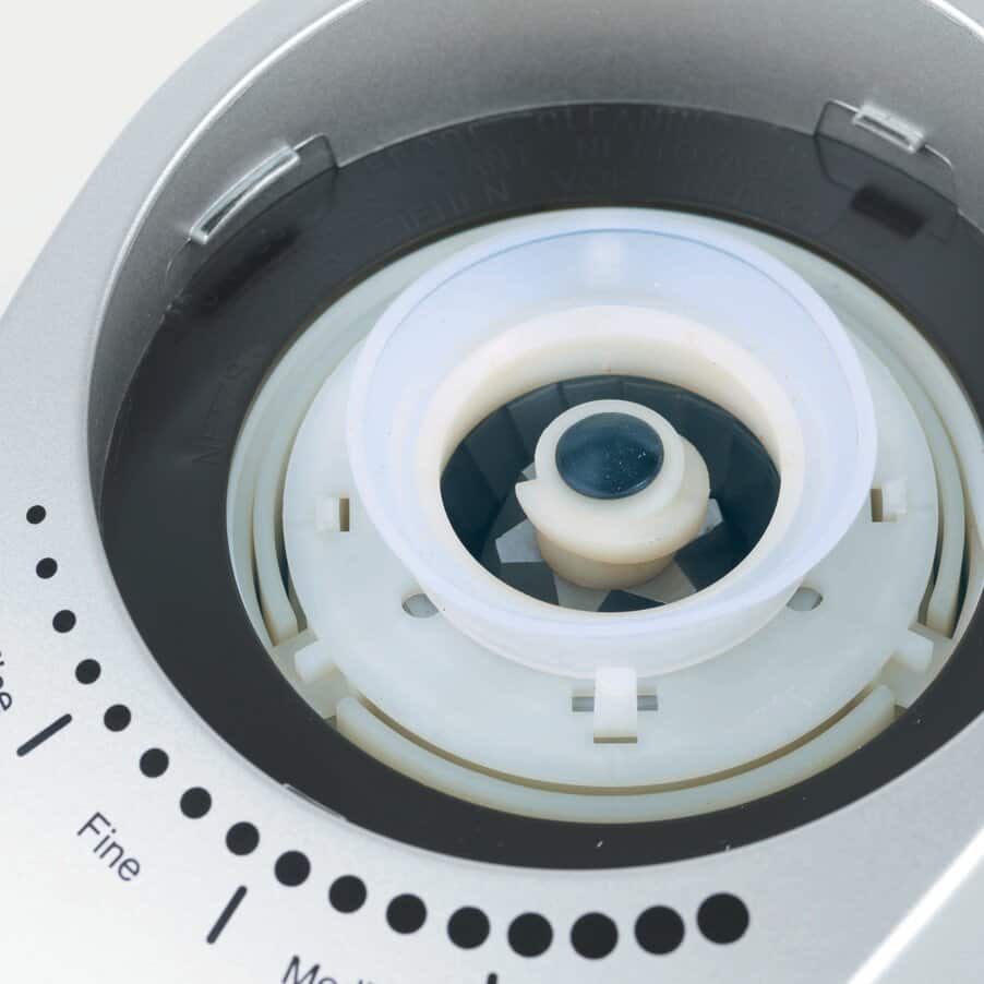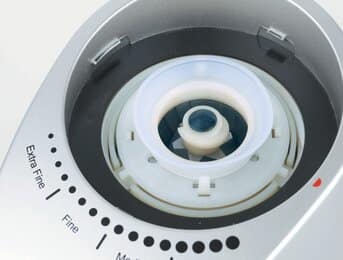 コーン式(円錐形)のグラインダーは低速回転でコーヒー豆を挽くため、摩擦熱が発生しにくい構造です。コーヒーの命ともいえる揮発性のアロマを逃さずに、プロペラ式よりも均一な粒度に挽くこともでき、安定した美味しさをお楽しみいただけます。