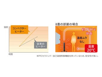 安全性に優れたPTCセラミック*ヒーター搭載により、自然対流と輻射熱を生み出し部屋全体をスピーディに暖めます。