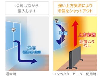 スピーディに部屋全体を暖めるコンベクターヒーター。窓からのコールドドラフトを防ぐスリム&ワイドデザイン。