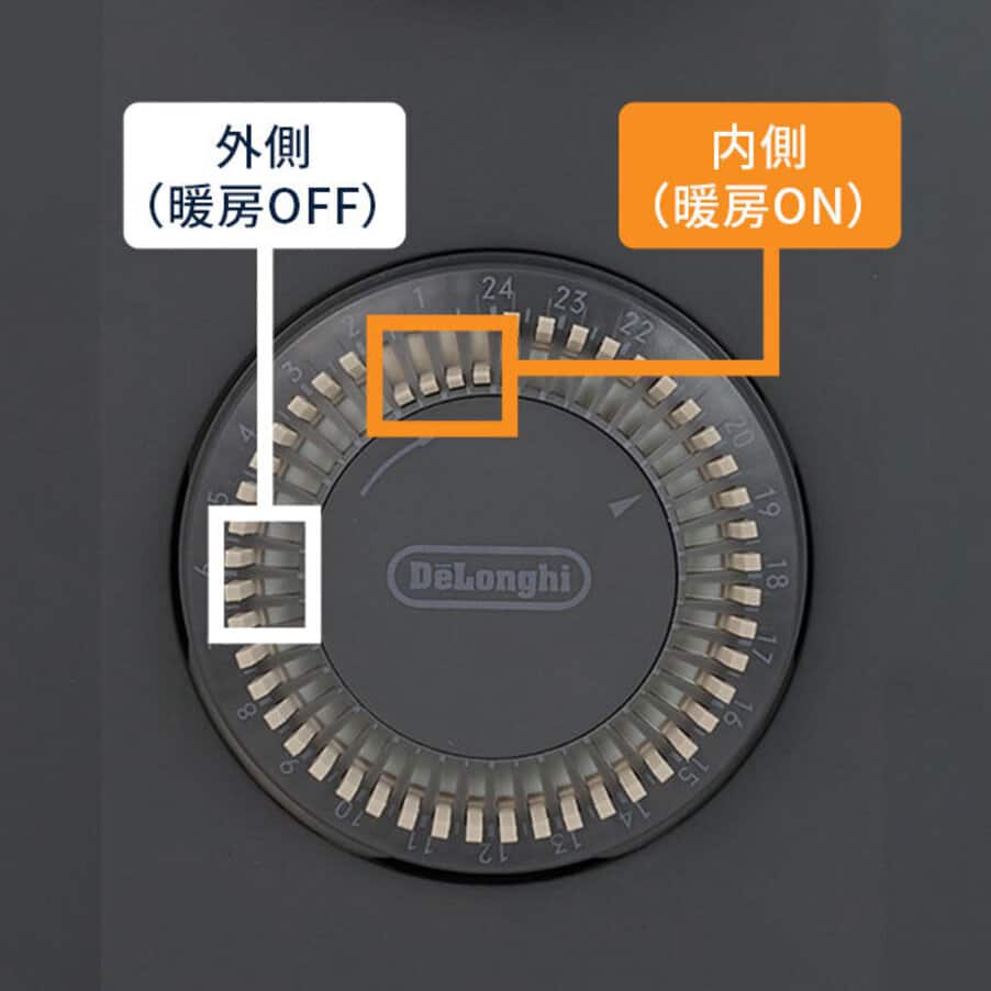 生活スタイルに合わせて使用できる24時間ON/OFFタイマーを採用。30分刻みで運転のON/OFFを予約できます。ONにしたい時間帯はピンを内側に、OFFにするにはピンを外側にするだけの簡単設定。ピンの太さを太くすることで、従来品に比べて操作性を向上しました。