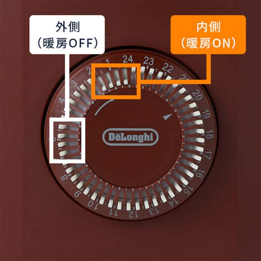 生活スタイルに合わせて使用できる24時間ON/OFFタイマーを採用。30分刻みで運転のON/OFFを予約できます。ONにしたい時間帯はピンを内側に、OFFにするにはピンを外側にするだけの簡単設定。ピンの太さを太くすることで、従来品に比べて操作性を向上しました。