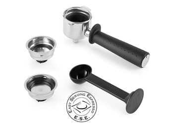 コーヒーパウダー(1杯用、2杯用)とE.S.E (Easy Serving Espresso)規格のカフェポッドに対応したフィルターが付属。タンパー/計量スプーンも標準装備。