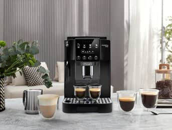 마그니피카 스타트 도피오로 원두에서 커피까지의 여정을 편리하게 집에서 즐겨보세요. 검은색과 회색의 세련된 색조합과 사용자 친화적인 터치 패널로 취향에 맞는 커피를 원터치로 즐길 수 있습니다.