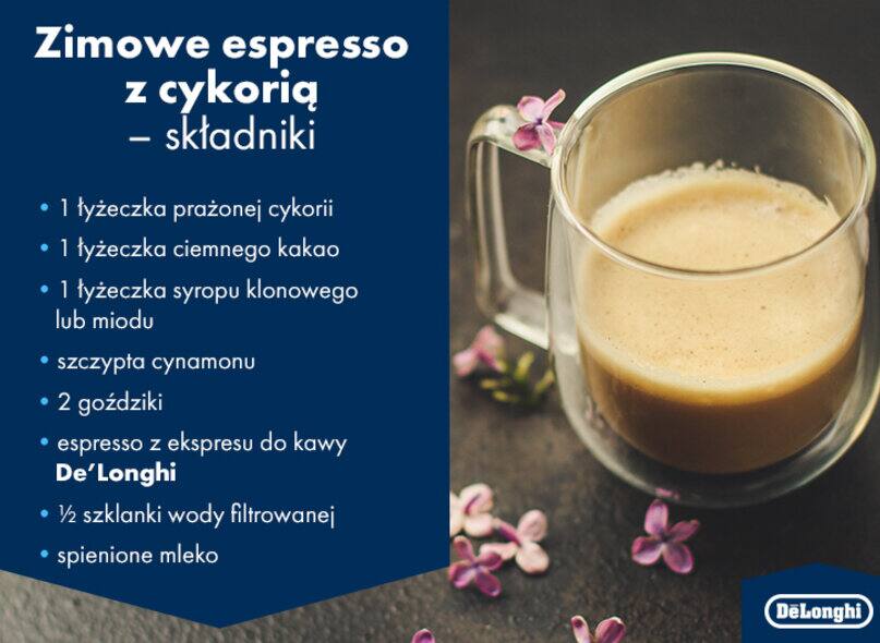 Krok 2. Do cykorii z przyprawami dolej mleko i podgrzewaj, aż napój będzie ciepły. W międzyczasie przygotuj pojedyncze espresso z ekspresu automatycznego De’Longhi. Przed zaparzeniem kawy na dno kubka możesz wlać nieco syropu klonowego lub miodu, albo innego słodziwa.
