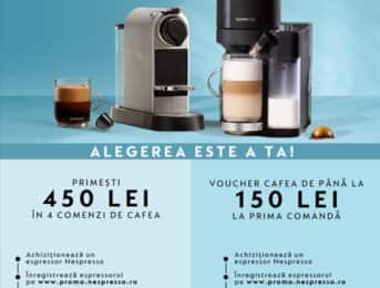 ALEGEREA ESTE A TA: cumpără un espressor participant și alege beneficiul tău: 450 lei sub formă de vouchere pentru 4 comenzi de cafea sau un voucher de până la 150 lei la prima comandă.